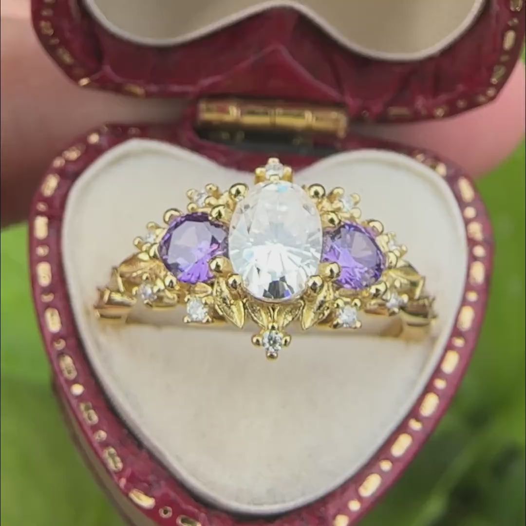 Unique Briar Rose Oval Moissanite and Lab Amethyst Ring