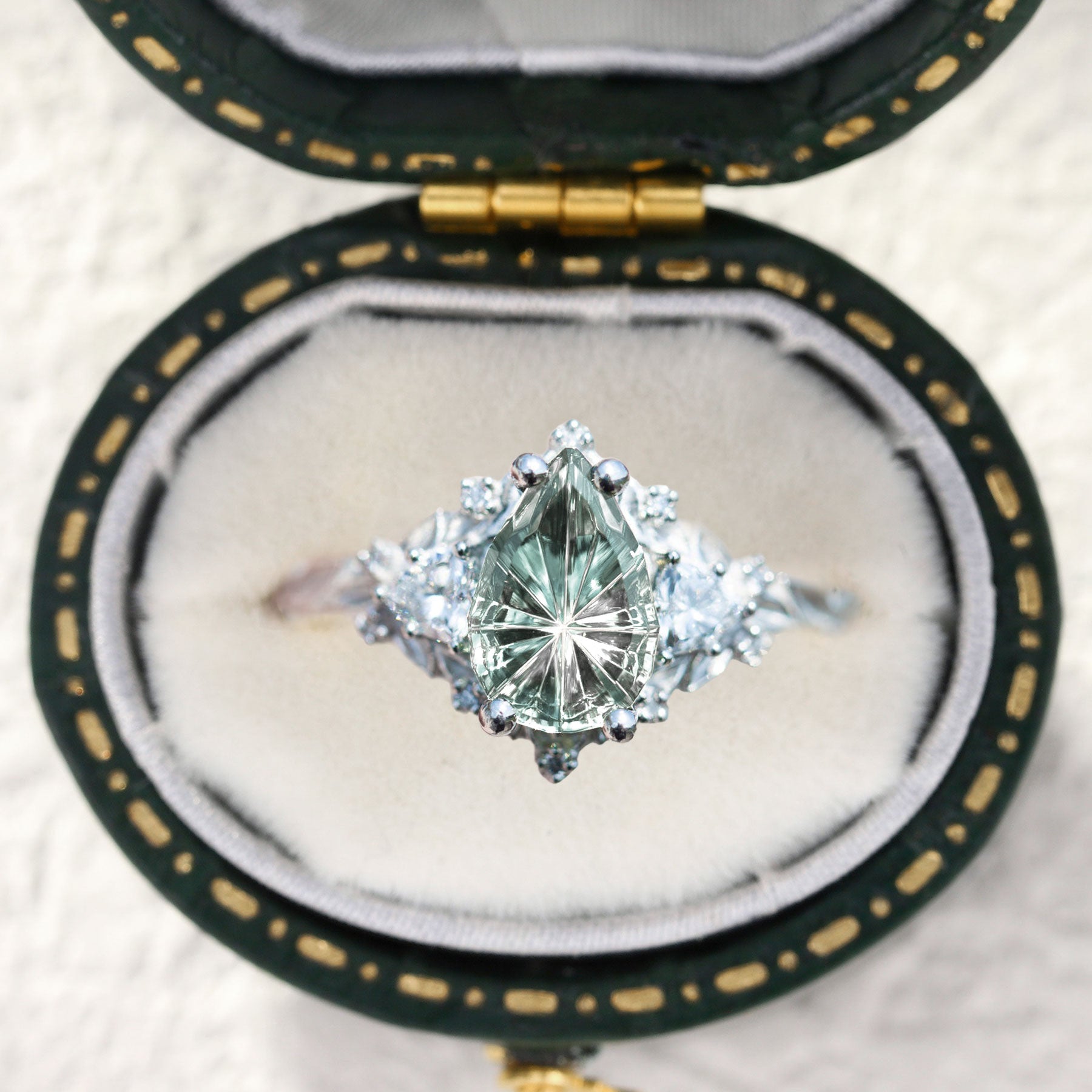 Unique Briar Rose Starbrite Cut Pear Lighter Green Lab Sapphire Ring