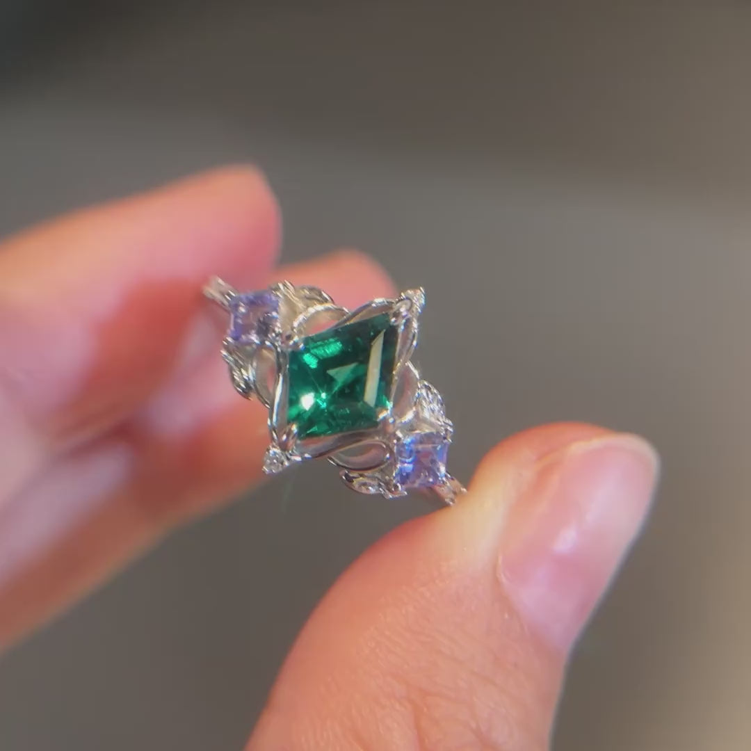 Unique Kite Three Stone Lab Emerald Leaf Ring