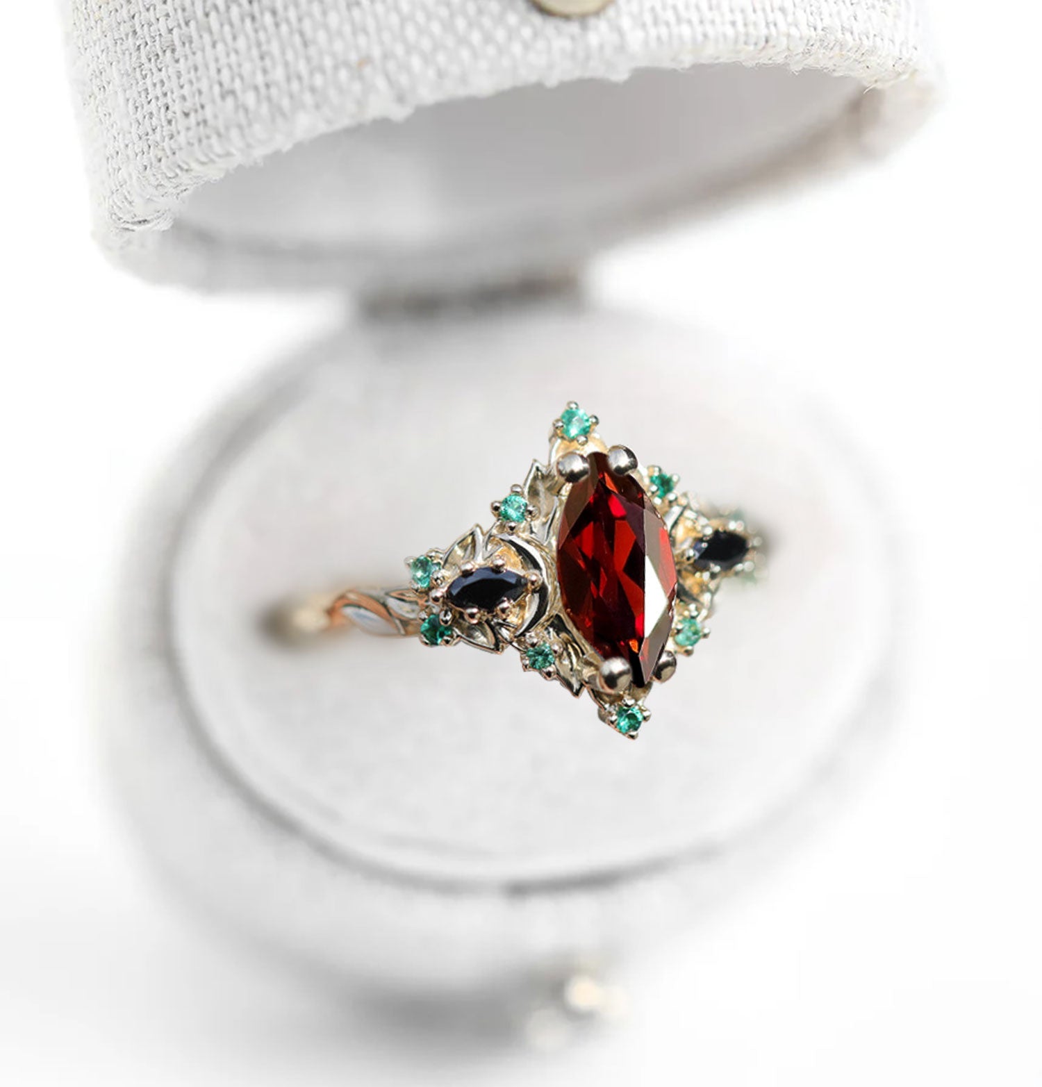 Unique Briar Moon Three Stone Marquise Garnet and Lab Emerald Ring