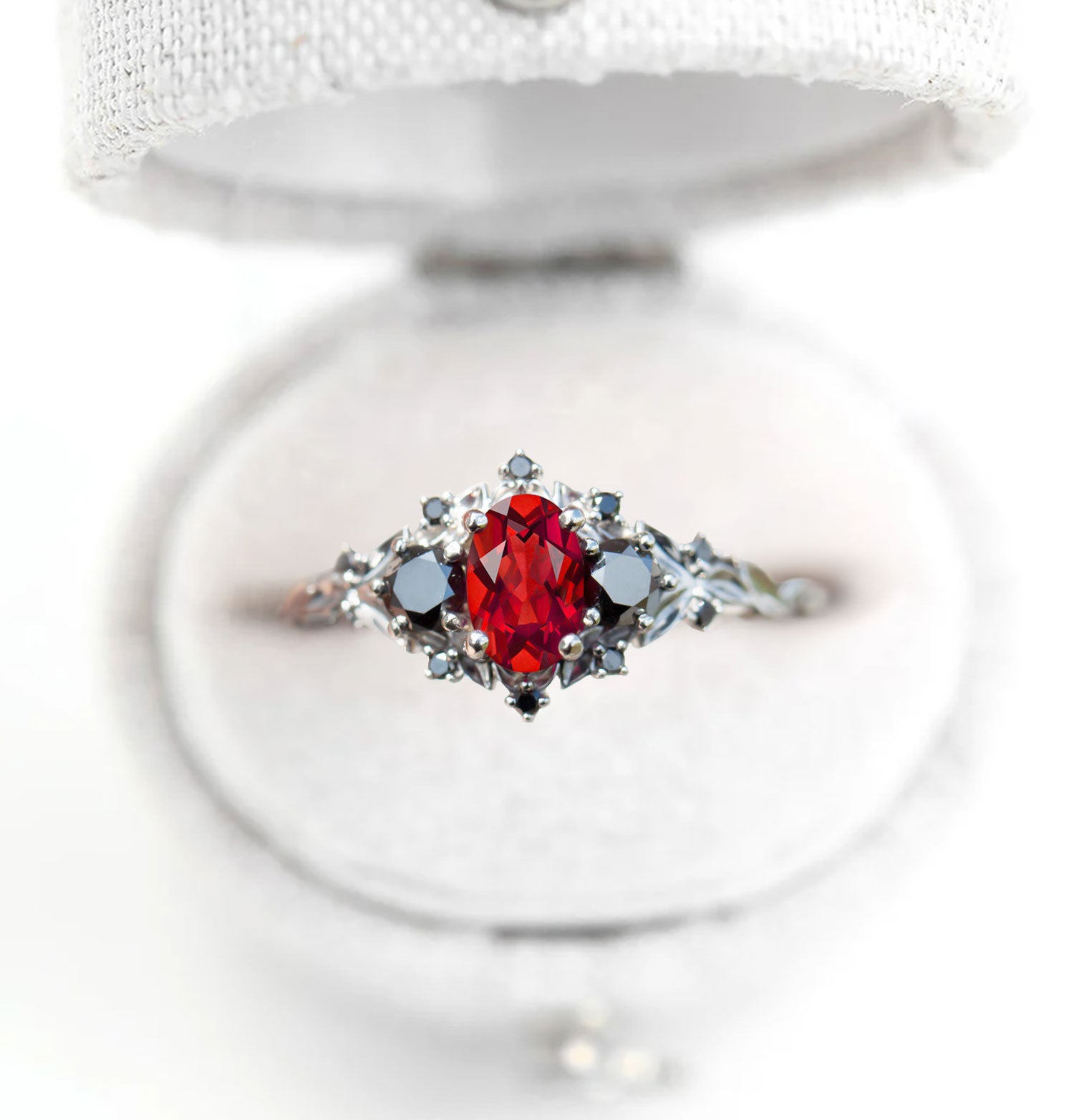 Unique Briar Rose Three Stone Oval Garnet and Black Moissanite Anniversary Ring