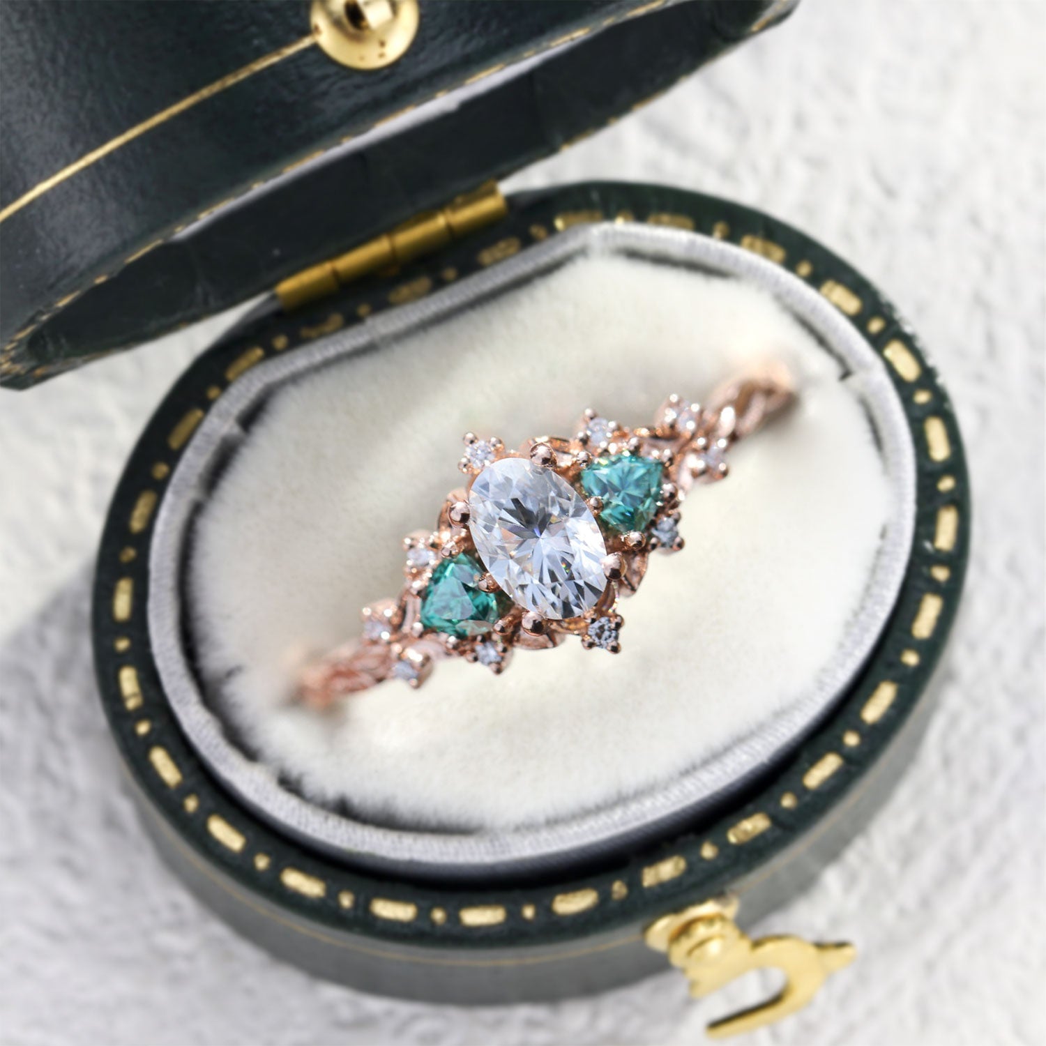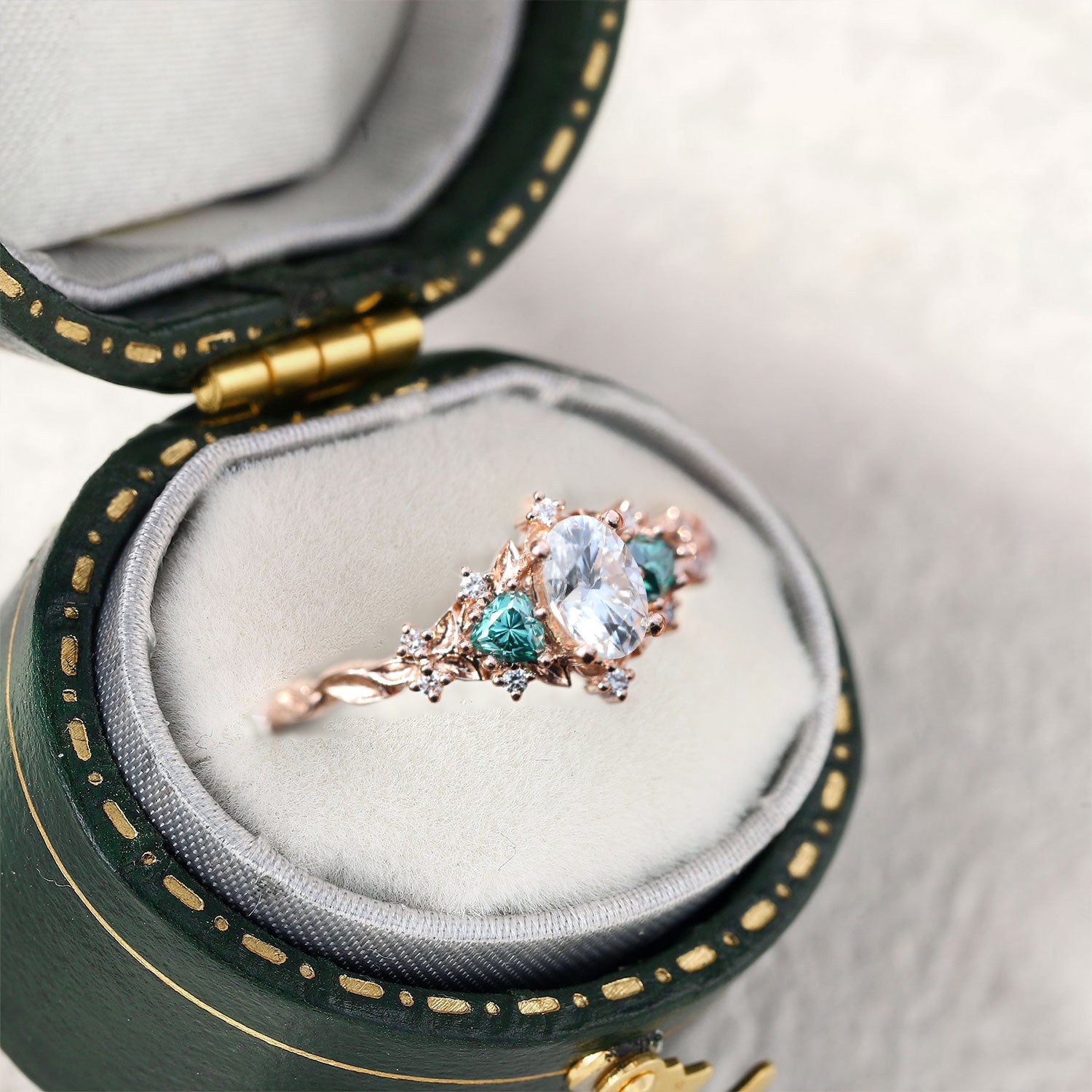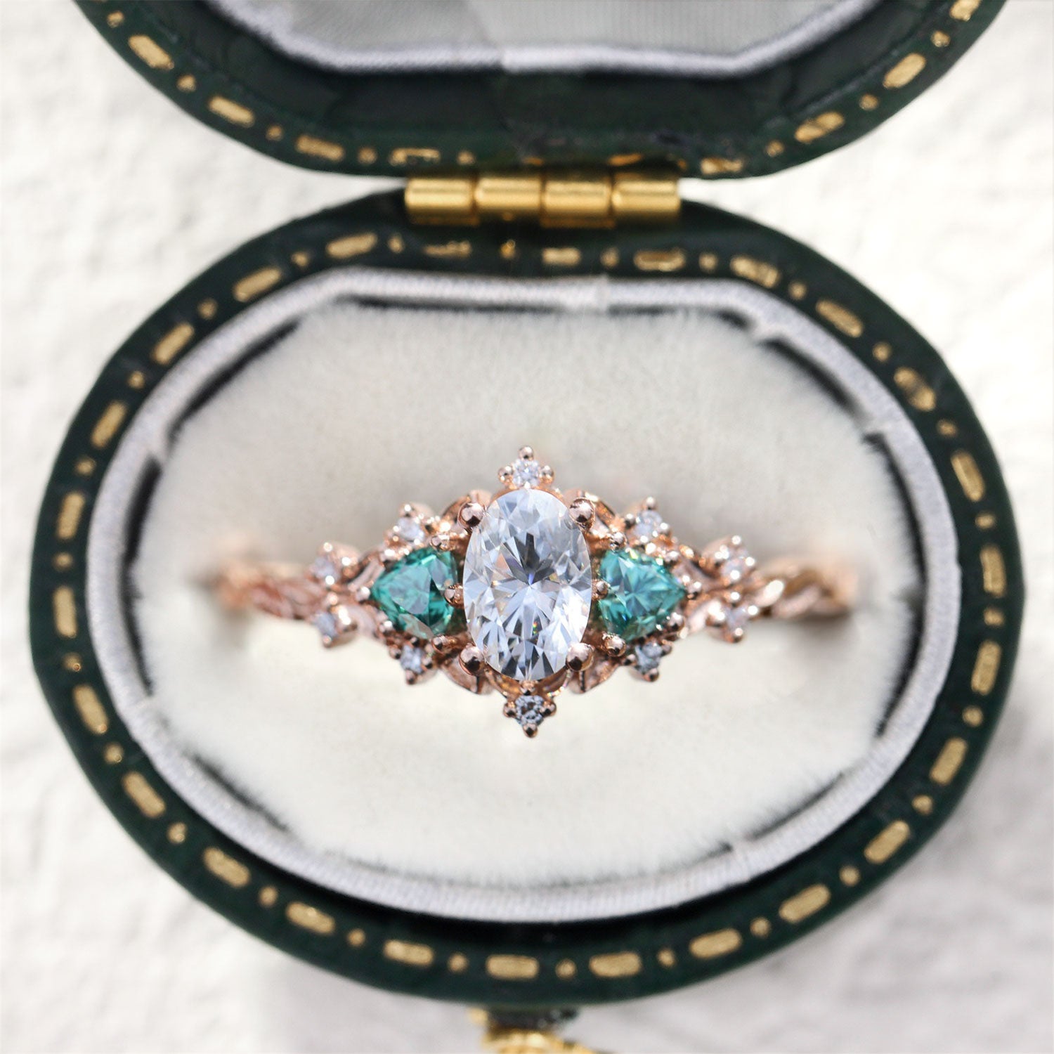Unique Briar Rose Three Stone Oval Moissanite and Teal Moissanite Ring