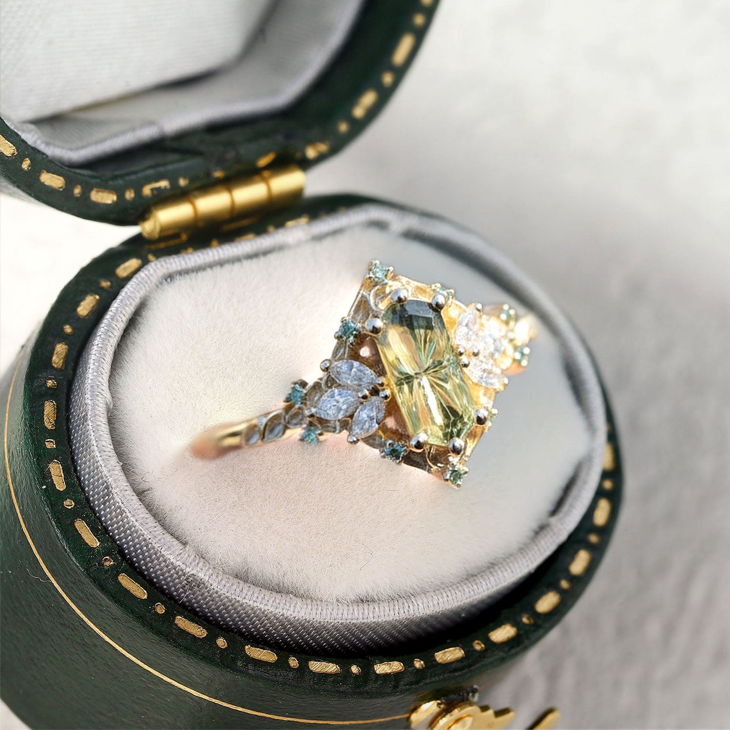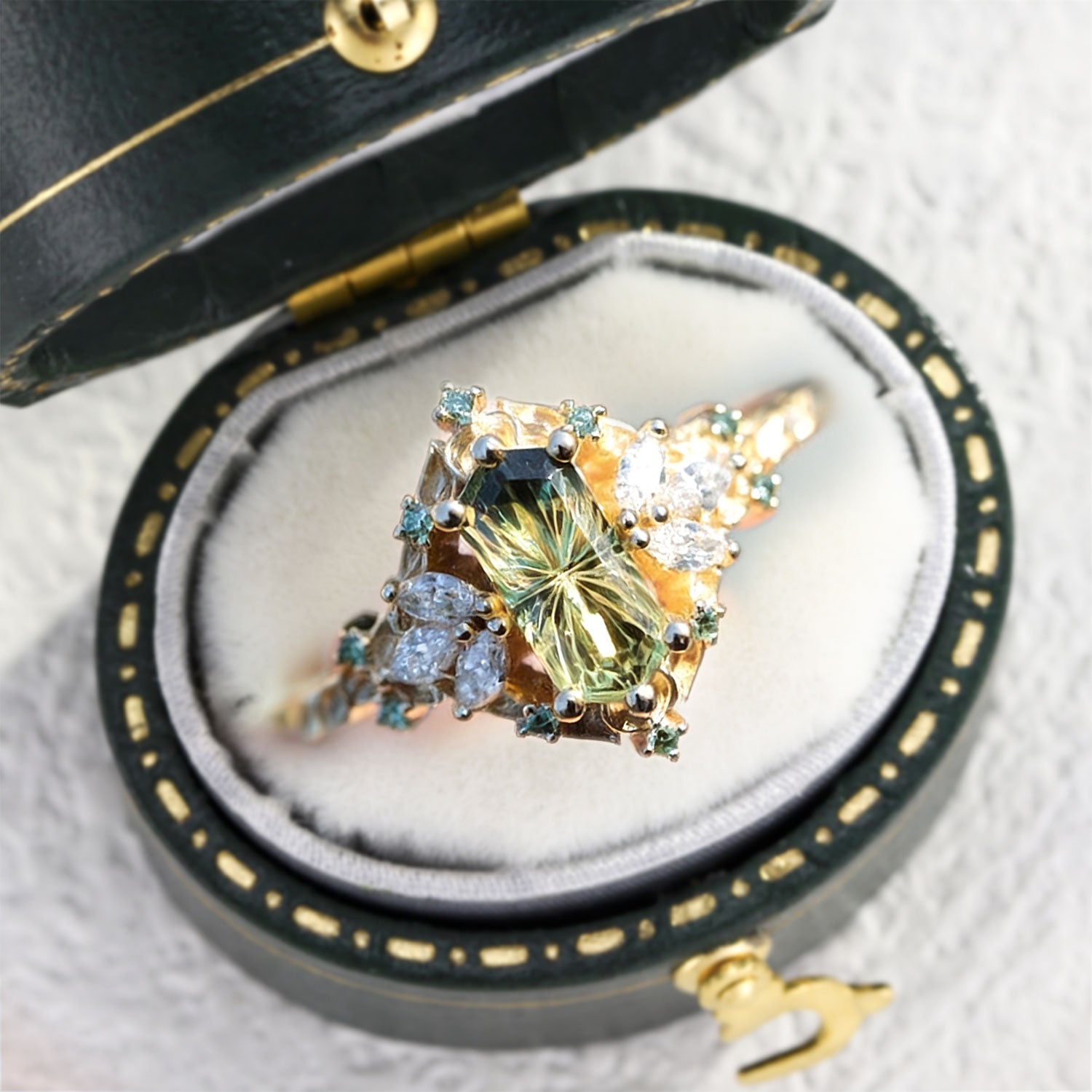 Unique Starbrite Cut Hexagon Green Lab Sapphire Fairy Engagement Ring