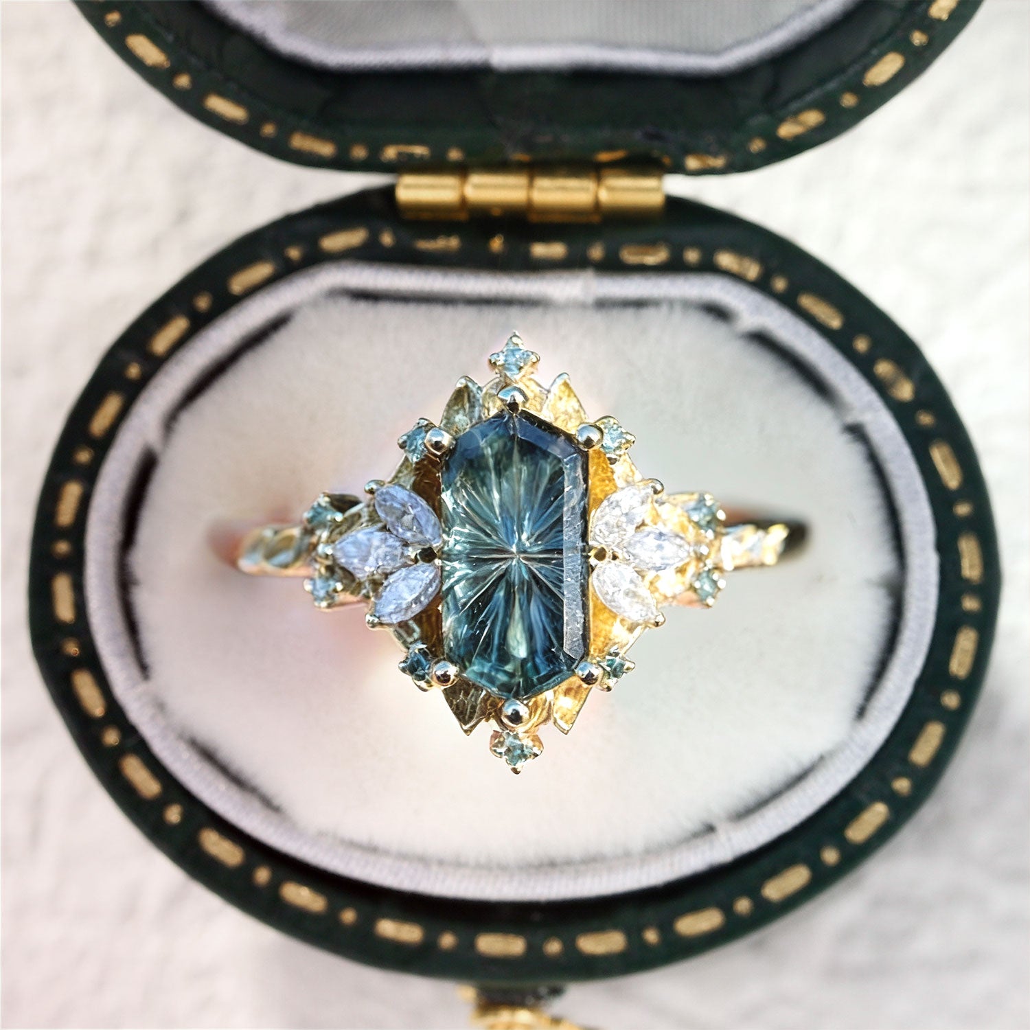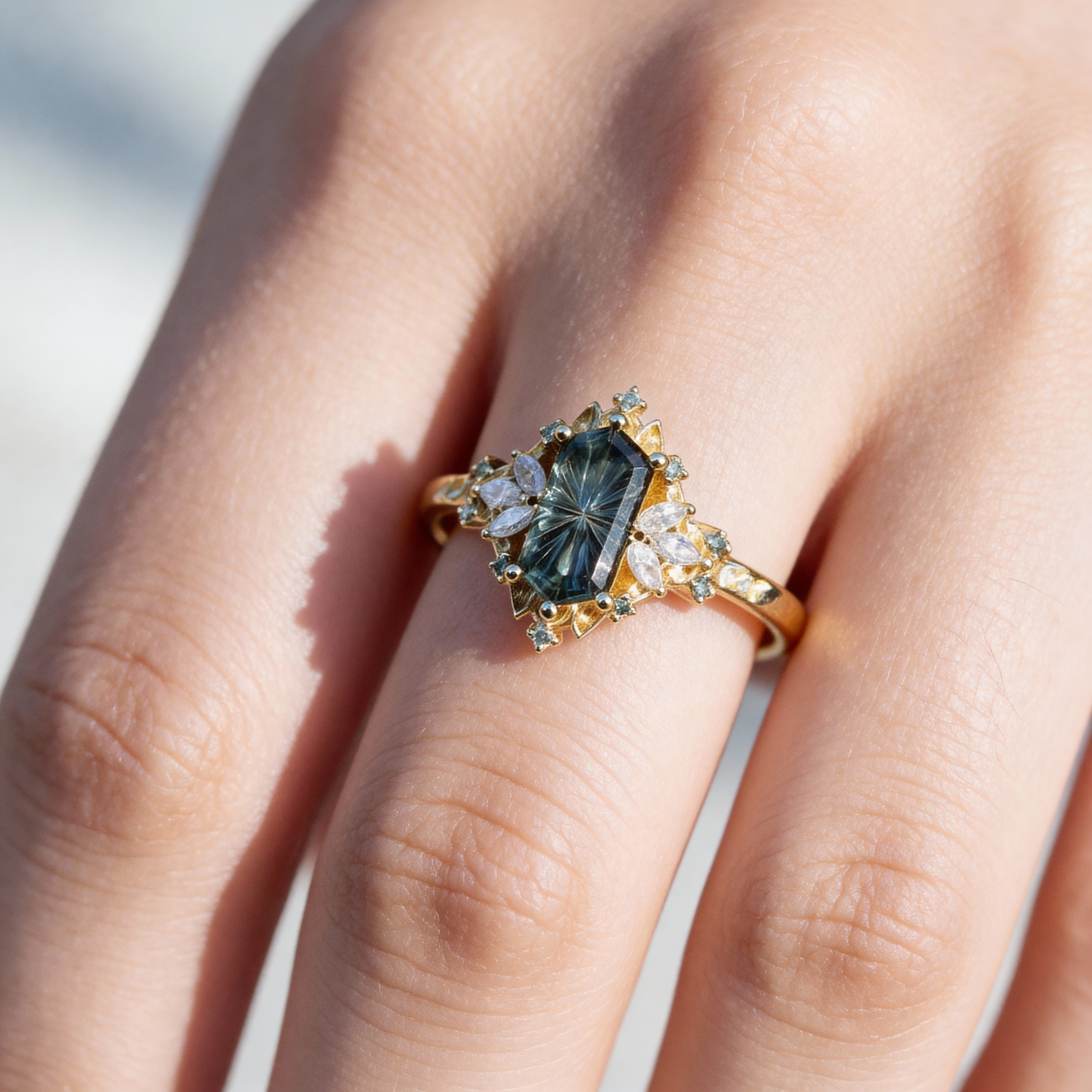 Unique Starbrite Cut Hexagon Lab Sapphire Fairy Engagement Ring