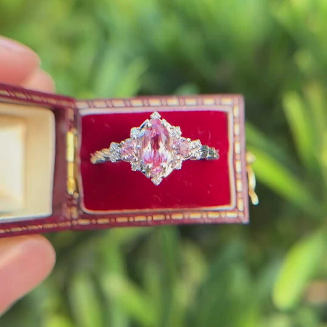Unique Briar Rose Three Stone Marquise Lab Padparadscha Ring