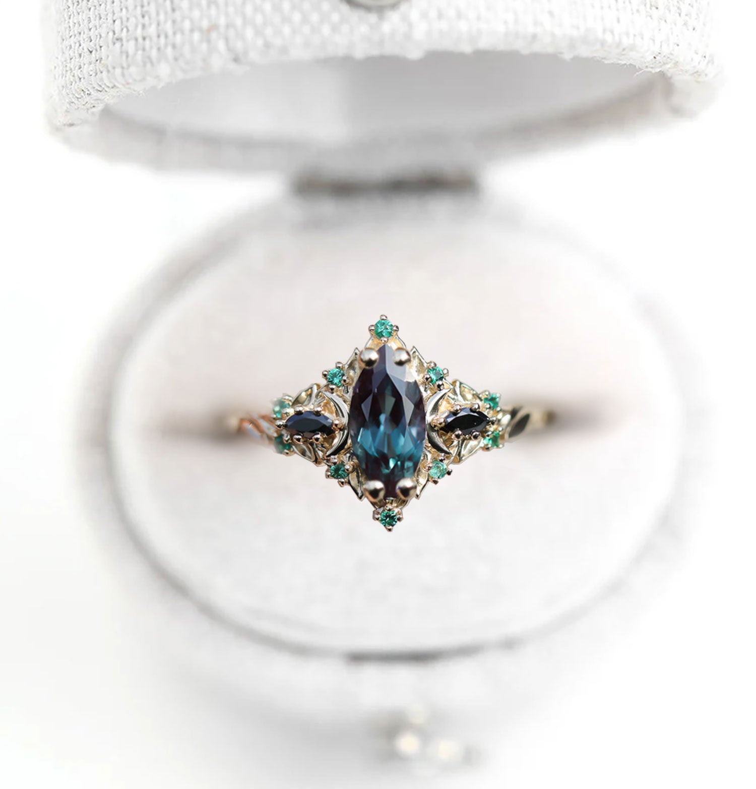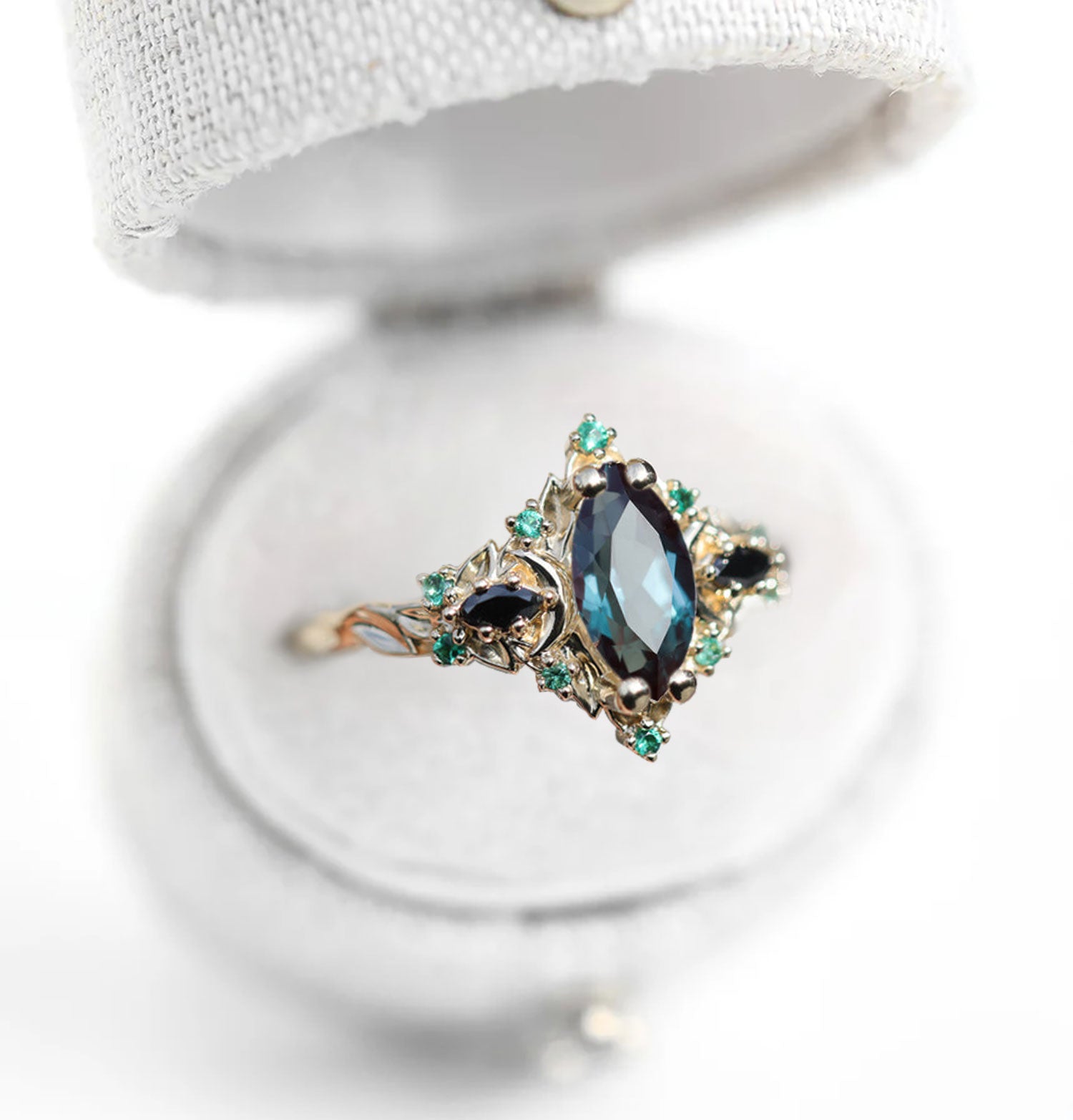 Unique Briar Moon Three Stone Marquise Lab Alexandrite and Lab Emerald Ring