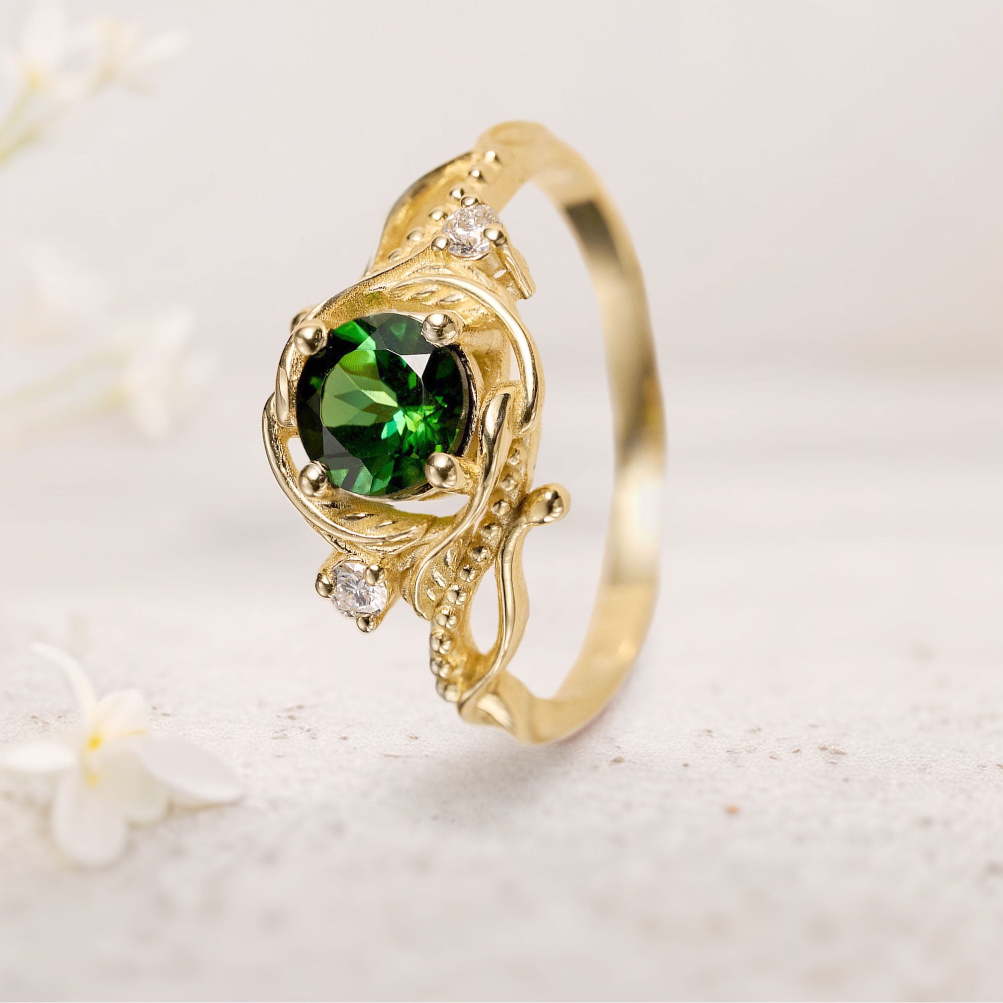 Unique floral engagement rings Round Nature Inspired Green Tourmaline Engagement Ring